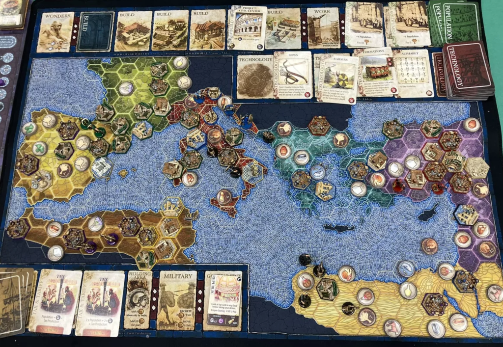 The game Mosaic: A Story of Civilization is a phenomenal game. One that my game group frequently brings out. The main thing players seem to get hung up on is the actions they can take and what the cost of those actions are. 100% of this information is on the board though. All of the cards in the image below are contained in the areas where actions may be taken. In each there is some smallish text that explains how that action works. So the information is there, its just kind of hard to read, gets covered by cards an it’s spread all over.