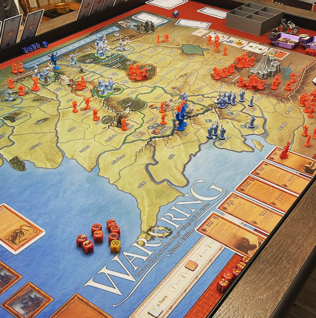 Contrast this with War of the Ring. The board in this game has mountains that block movement; but they are super easy to overlook. The Free Peoples are all blue while the Shadow side is all red. But within those there are multiple factions, which is almost impossible to discern. So in GKR, you can instantly process what is happening, while in War of the Ring, you have to take it all in and try not to miss anything. Yes, there is more going on in War of the Ring, but these problems go away with a few very minor enhancements. We added 3D mountains and colored bases to all the figures, and now it has that same ability to be instantly understood.