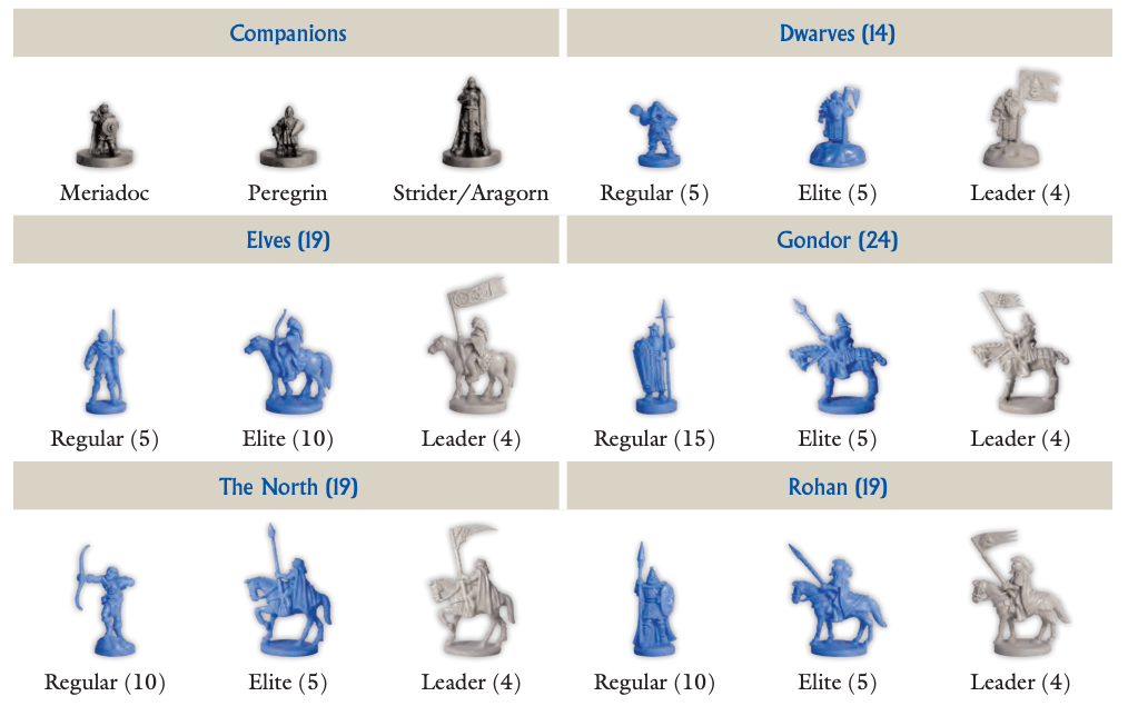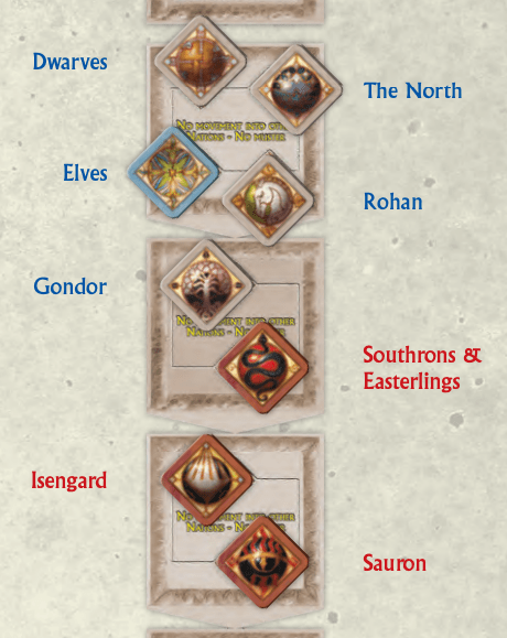 Another beloved game with super obvious accessibility problems in this area is War of the Ring. The game has 8 political tokens. These are two-sided, and it’s important to note which side is up. First off, the icons on these cards are extremely hard to differentiate. Yes, I can study them and kind of see what they are talking about. But in play, you look across the table and you have no clue which one is for which faction. Also note that the only difference between the two sides is the border color. This means colorblind people are likely going to struggle as well.