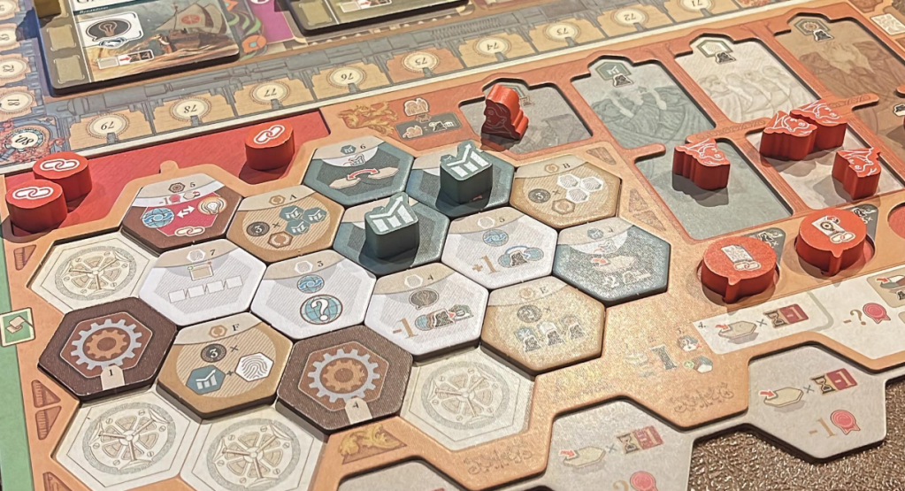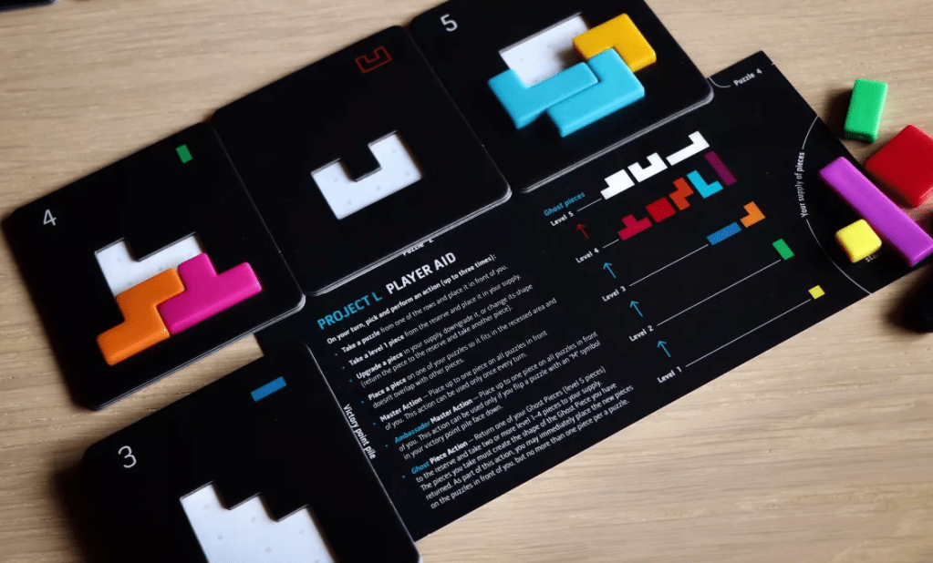 One way to make parts easier to handle is to offer some kind of physical support. Some mechanism that makes the game more accessible and easier for everyone to play. A simple demonstration of this is Project L. In this game, you’re collecting shapes that you will need to fit into tiles. When you complete a tile, you get your parts back, and you score the tile. These tiles are double layered such that the pieces fit in and can’t slide all over. The pentominoes aren’t particularly big, so it is very welcome that the tiles are double layered.