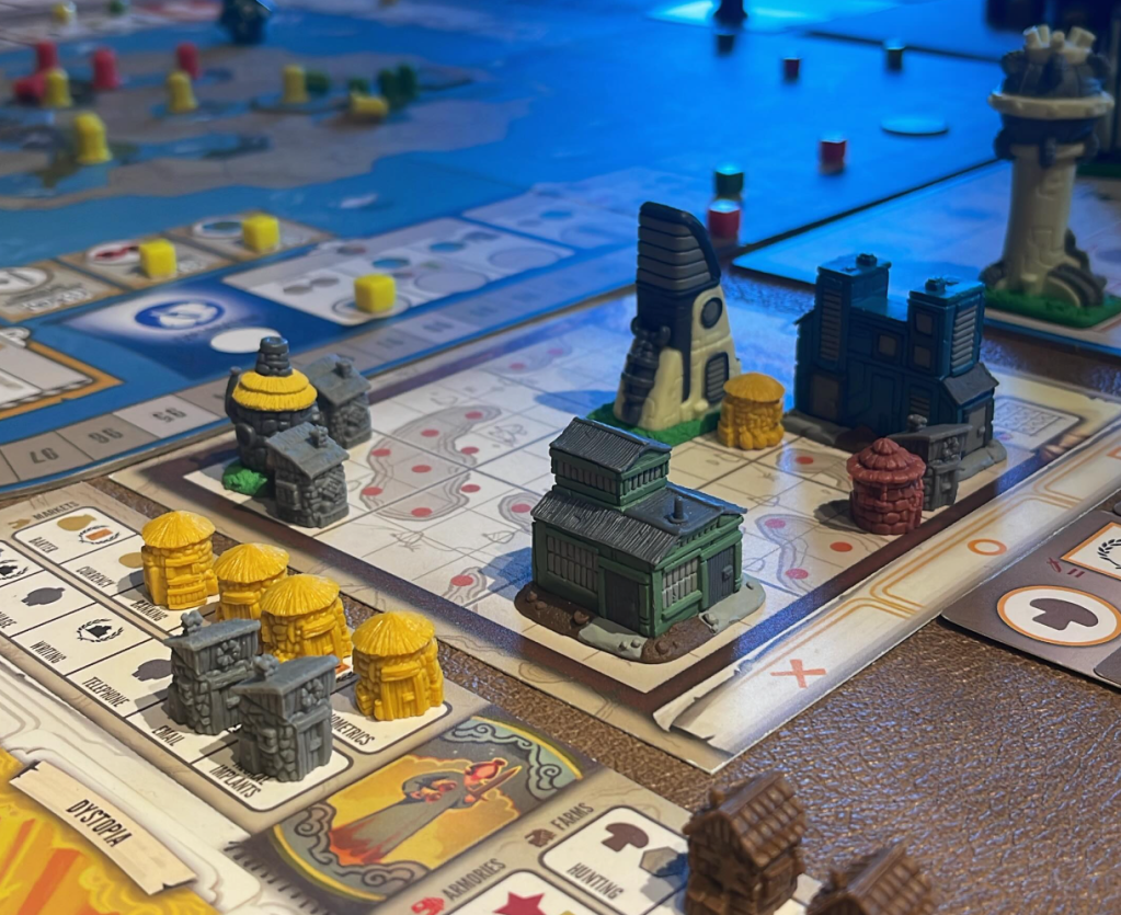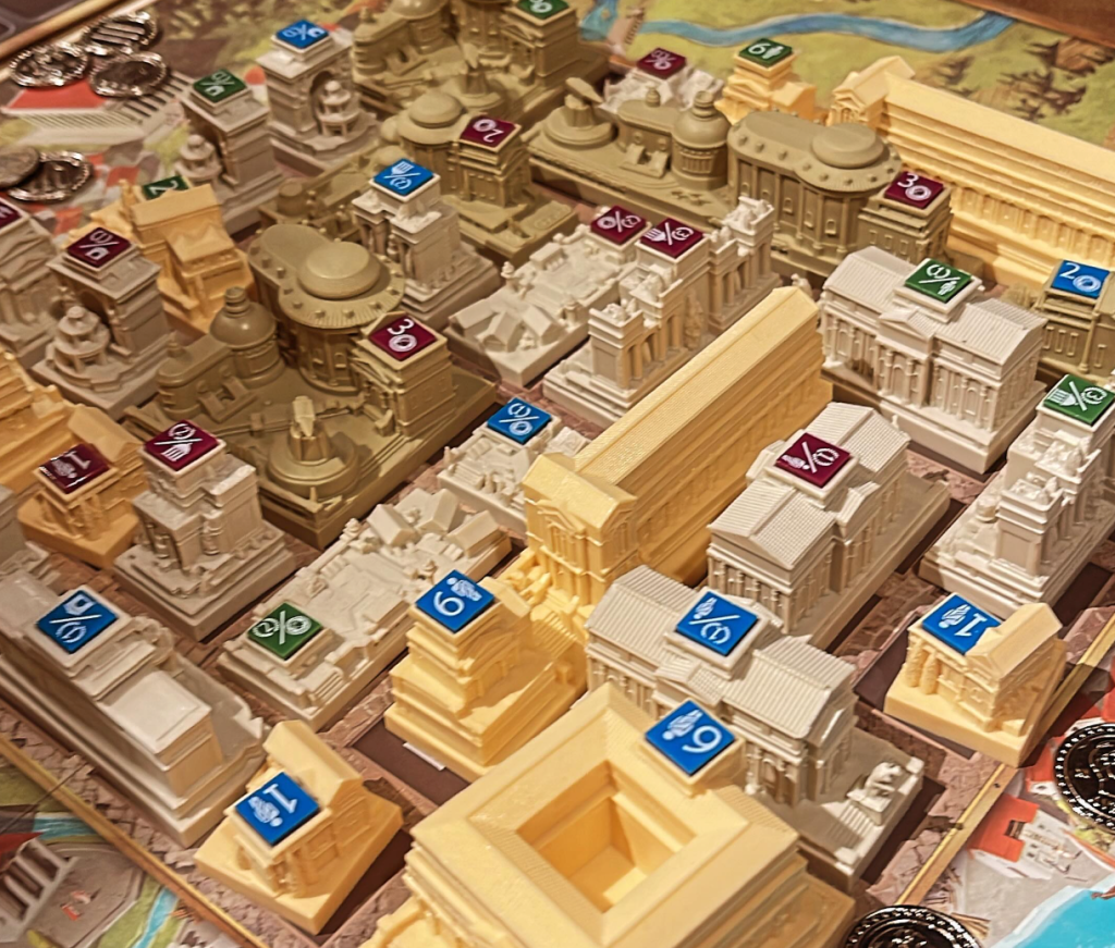One final sample to consider is Tapestry. This is yet another game with big, fancy buildings. While the physical size does make them easy to pick up and handle, I want to instead focus on the way in which you can differentiate the buildings. The second aspect of the principle being discussed here is that you can easily tell the parts apart from each other. Note how the unique buildings are multicolored and all look different. In contrast, the small, single-space basic buildings all look the same. This makes it easier to track how many you have of each of those, which is relevant to the way the game is played. So, while it might have been tempting to make all those small buildings unique, it would have made the game harder to play. It is neat to see how small details like this can make a game more accessible. And sometimes it means doing less and being thoughtful about the physical components and how they will be used.
