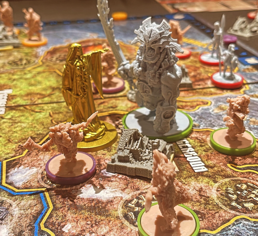 One common aspect of many CMON games is that they always have lots and lots of miniatures. These minis are never pre-painted. So as a publisher, they could just print them all in one color to save money and let players sort it out. Fortunately, they do not do this. Instead, they use color and bases for the minis to help players identify the pieces on the board. Let’s consider the game Blood Rage. In the image below, you can see the god figure (in gold), the special monster (in grey with a green base), and all the player figures with tan plastic and colored rings on their bases. This all helps players to instantly recognize the pieces and easily know who each figure belongs to. This is absolutely critical to the ease with which you can play this game. It’s a great example of how accessibility makes things better for everyone.