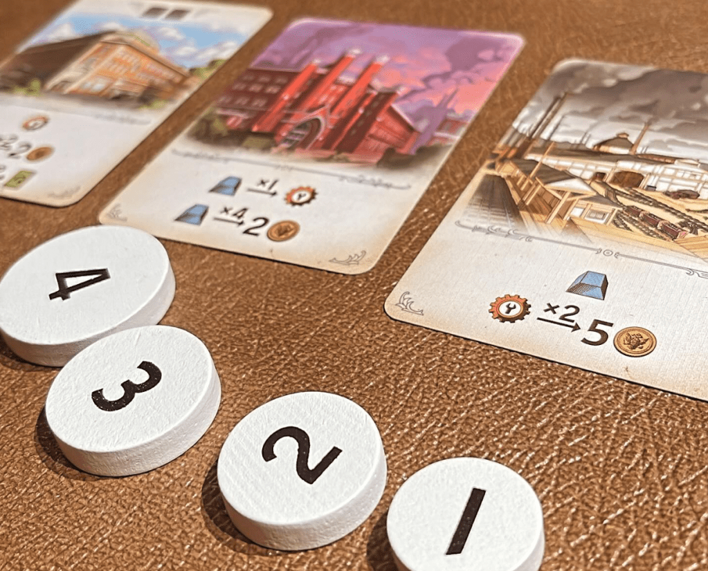 But you don’t have to use big chunks of plastic to have multiple signals to players about a pieces function. Furnace is rather small in comparison, and doesn’t have large extravagant pieces. In this game you have 4 tokens to bid with. You can see in the image below that the tokens are numbered and scaled according to their number. 4 is your most powerful piece and this is reinforced by the fact that it has a larger token. The game uses both content (the numbers) and size to communicate to users which is the most powerful. Could your game use something as simple as this to improve its accessibility?