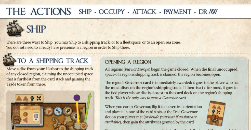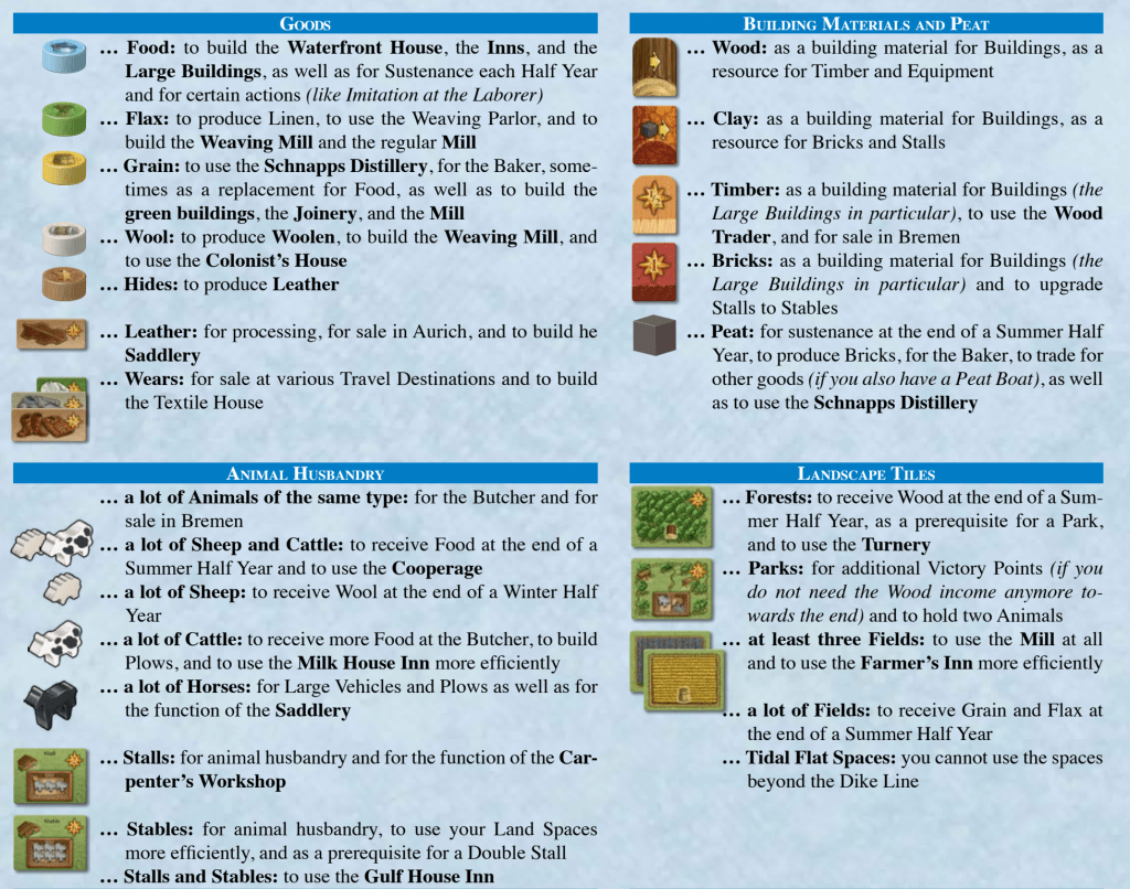 Finally, let’s consider Hansa Teutonica. The game isn’t really built around icons, but they are used in some key places. In particular, note the player action reference on the bottom of the player board. It’s not enough to teach you the game, but once you know how to play, this is a great reminder of how each action works. It’s interesting that they could have written it out, but instead went with symbols that are chained together to form a structure that explains each action.