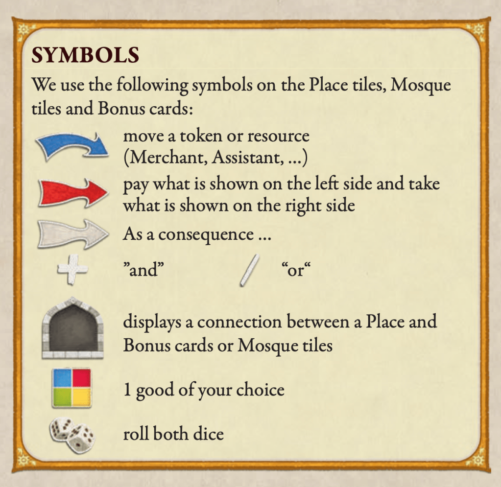 The game Istanbul has a different approach to modifiers. Instead of overlaying them, they have different types of arrows. The blue arrow moves stuff, the red arrow spends stuff, and the white arrow is a consequence. It is an interesting approach. Once you know how to read it, it’s super easy to understand the meaning of the icons alone and together.