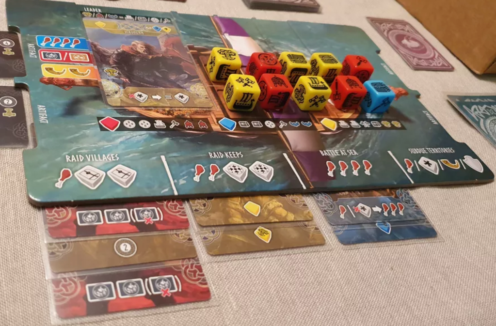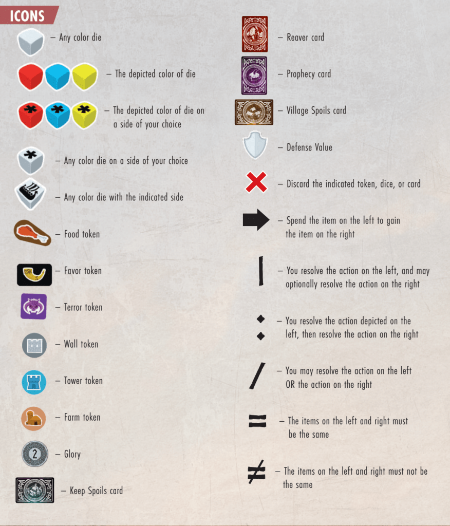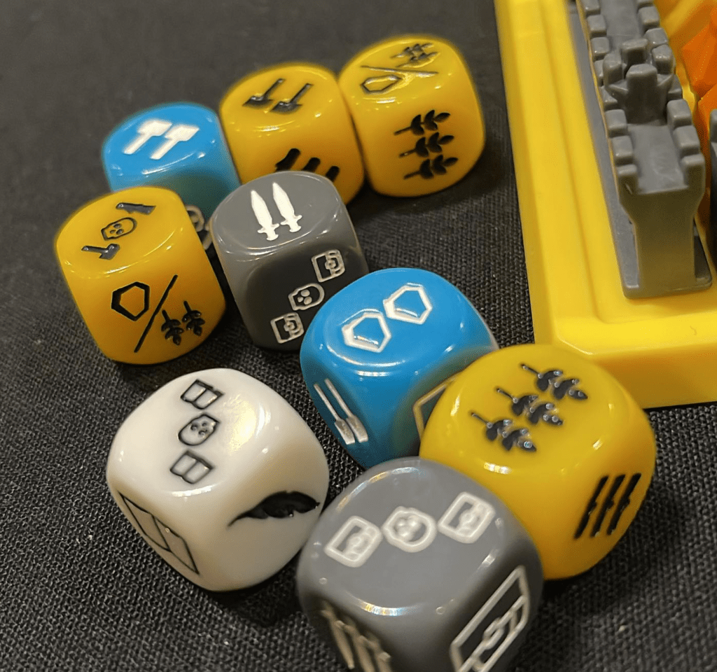 Another game that uses icons in an extremely simple fashion is Era: Medieval Age. Most of the icons on the dice simply grant you that number of the given resource. Some are tracked on your player board; others are temporary and only applied during conflict, etc. Given the number of dice to resolve, it’s excellent that the meaning behind the dice is so simple. If it were super complex, it would definitely be hard to choose what to reroll and what to keep.