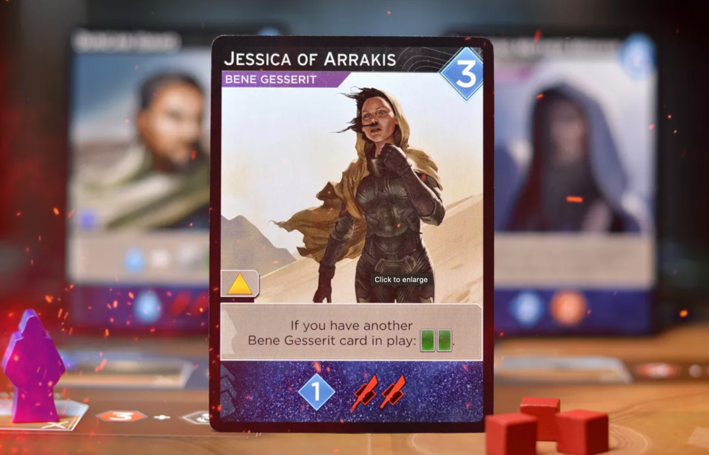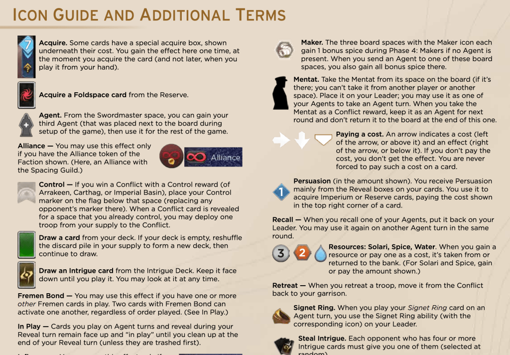 Another game that does this well is Dune: Imperium. The bottom part of the card below grants 1 buying power and 2 conflict power. The icons achieve this faster and with instant recognition. In this case, it’s interesting that the purchasing power image is actually more of a symbol; it’s just a diamond. While the conflict image is an icon as it represents a weapon used in combat. One may require some explanation (even if it’s very brief), while the other is more naturally understood. There are other icons and symbols at work on the card, though. It’s interesting to see that the green cards probably mean you draw cards, while the yellow diamond is definitely a symbol, and without the rules, you have no clue what it means or does.