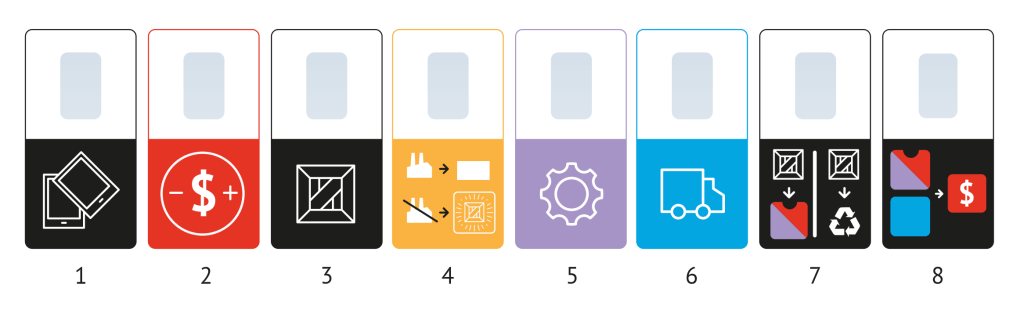 In some games, the icons become almost a special language, used as an anchor for everything in the game. Smartphone Inc. is one such game. In the first image below, you can see the 8 steps in a round. Each is identified by an icon. Those icons are then used on the player boards, where players will pick their actions. There is a perfect mapping in that the number of symbols you have of each type is how powerful that step of the round will be for you. For example, blue boxes with trucks become your ability to spread across the map. These symbols are carried throughout the entire game and unify it so elegantly. The icons create a very satisfying player experience and are the core feature of the game.