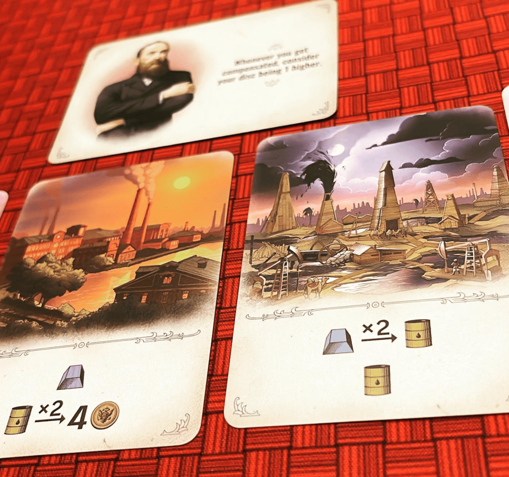 Some games use icons and symbols almost as a sentence structure, taking on a more literal language, if you will. In these, the icons are meant to be read from left to right as a chain of events. The game Furnace is essentially built on this idea. The card on the right in the image below says to convert an iron into an oil can up to 2 times, then gain 1 oil can. The symbols are super easy to understand, and the number of possible combinations is huge.