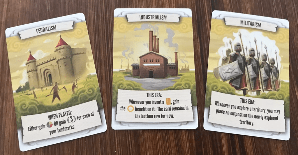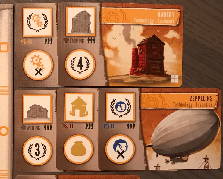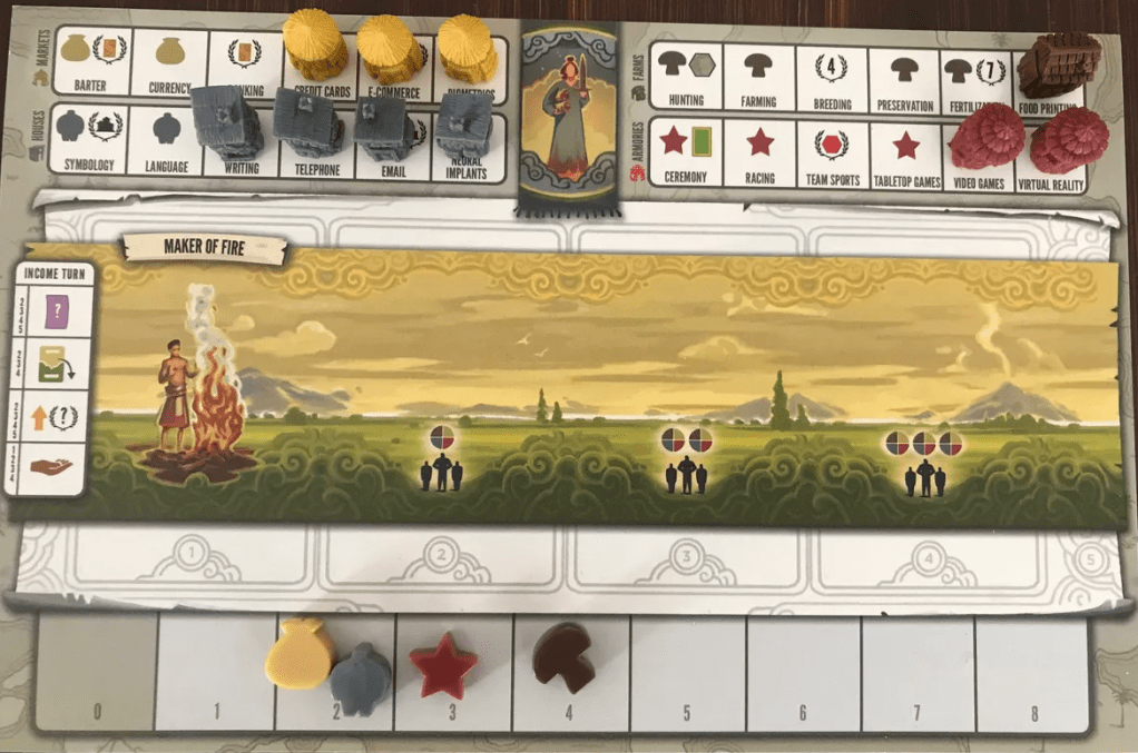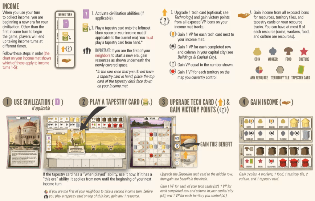 Tapestry is a civilization game that can best be described as a game of tracks. There are 4 main tracks on the board (plus a 5th side one if you have the expansion content). Players’ boards present additional tracks to progress on. Core to the game is the iconography. Once you know how the icon system works, you can interpret almost anything you see in the game. Most importantly, for the topic at hand, you can see across a huge array of components how consistent the design is.