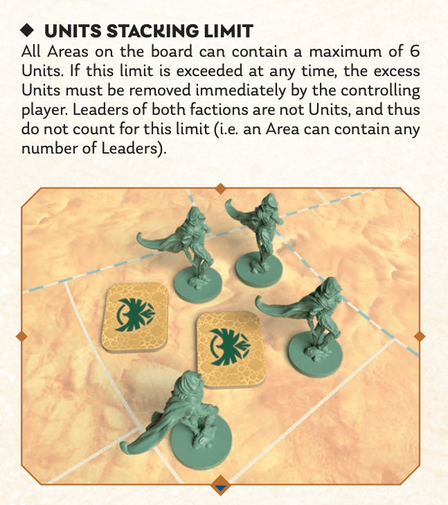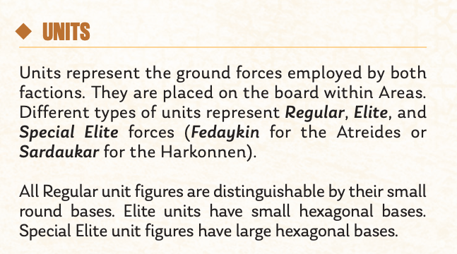 Next I want to focus on just a single term used within a game. In this case, I am looking at Dune: War for Arrakis. We will focus our attention on just the term “unit.” It has a special meaning in the game, and it’s executed throughout very well. The first time we encounter this in the rules is when it’s introducing the components. We immediately see there are “leaders” and “units.” At this point, the weight of the term “unit” hasn’t hit home. But it’s there as a reference, which new players will no doubt return to double-check. Note that leaders are in a brighter red than the units. This is a crucial detail that makes the game much easier to understand.