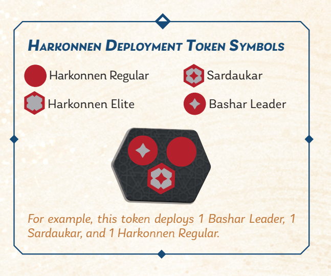 The game has random deployment tokens, and the same symbols are used there. The only nuance I wish they had included is shading the red and green differently to reflect the troop type (leader vs unit). Even still, we can see the symbolism and label for these consistently carried out.