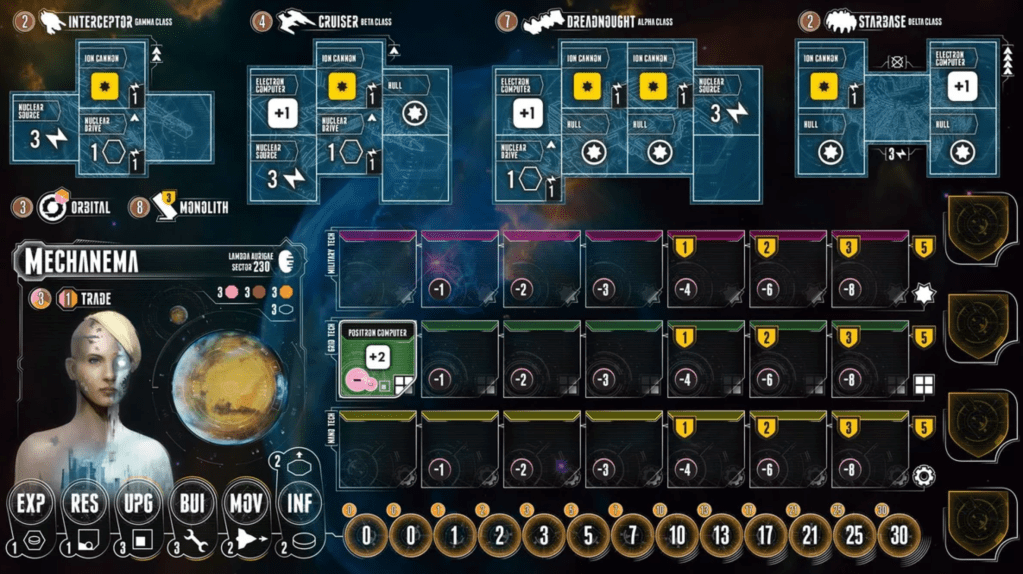 The second mechanic that I greatly appreciate is that when you add a tech tile to your board, it automatically creates a discount on your next tech tile in that row. This simple detail lets players add tech tiles in the order they choose. You can skip straight to an expensive one, or you can inch up to it so that you get it cheaper after buying several other techs. This detail means there isn’t a strict tech tree you have to follow. This keeps the evolution of your technology far simpler and allows the player more agency in the strategy they pursue. It’s such a simple little detail, but the impact on the gameplay and experience is just awesome.