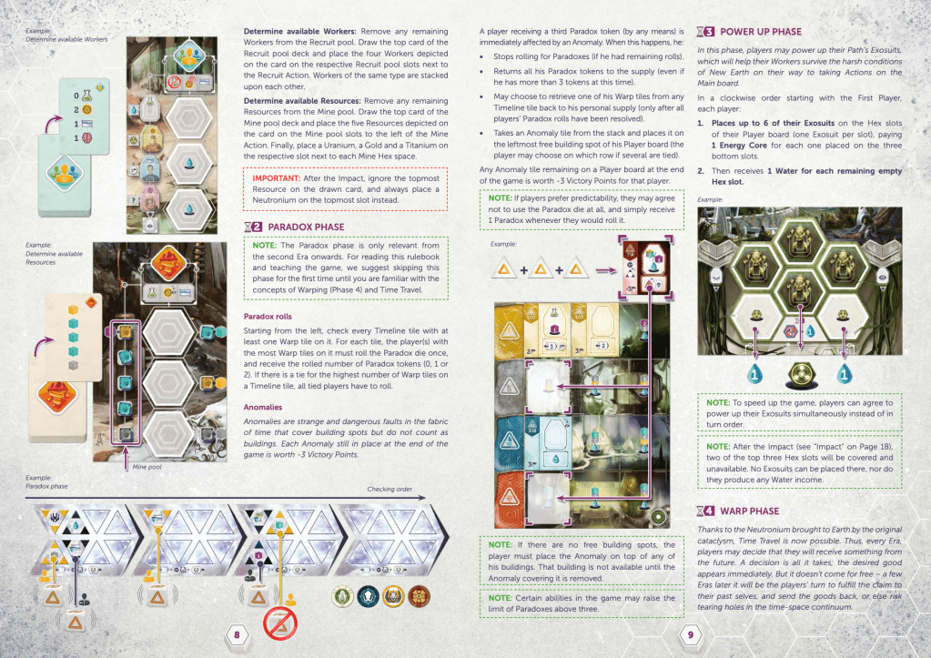 Anachrony is a really complicated game with a lot of moving parts. It should come as no surprise that the rulebook is dense and very content-heavy. That said, you can see that things have a little more room to “breathe.” The pages are definitely full, but there is just a bit more room around things so that it feels more polished.