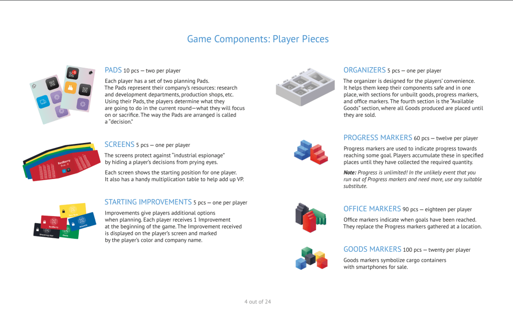 Finally, let’s look at the rule book for Smartphone Inc., where we see what I might call an extreme usage of white space. The rule book is perhaps one of the easiest to use and most beautiful I have encountered. But even saying that, it feels unrealistic to expect people to take such an extreme approach. Even still, it’s great to see just how beautiful a design can be by simply using white space liberally and effectively.