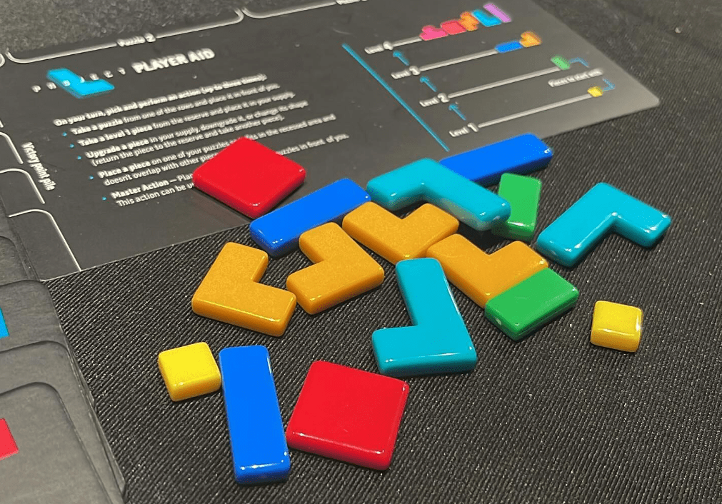 The two main components in Project L are very well designed and are super easy to interact with. First, the Tetris like shapes are sufficiently sized that they are not hard to pick up. Secondly, the cards you put the pieces onto are dual layered and therefore hold the pieces in place extremely well. This keeps things nice and tidy and makes it very easy to interact with. Finally, the pieces aren’t “stuck” into the boards, they fall out when you turn them over. All of this combined makes this simple game a breeze to play and lets players focus on their strategy and not fiddling with tiny bits.