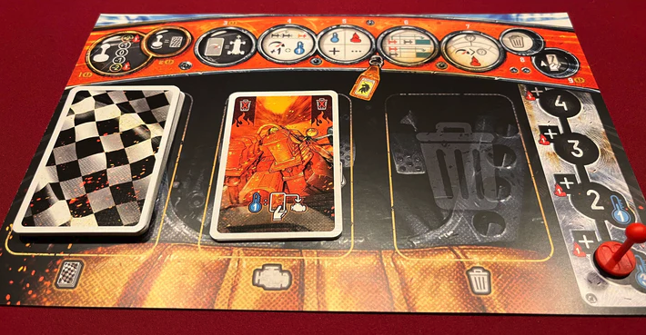 Heat: Pedal to the Metal uses grouping on its player dashboard to organize the systems players must manage during the game. The dashboard divides into clear functional zones: gear tracking on the right side, card locations (there are 3 distinct locations), and a turn reference across the top. This grouping ensures players can easily interact with the key aspects of the game.