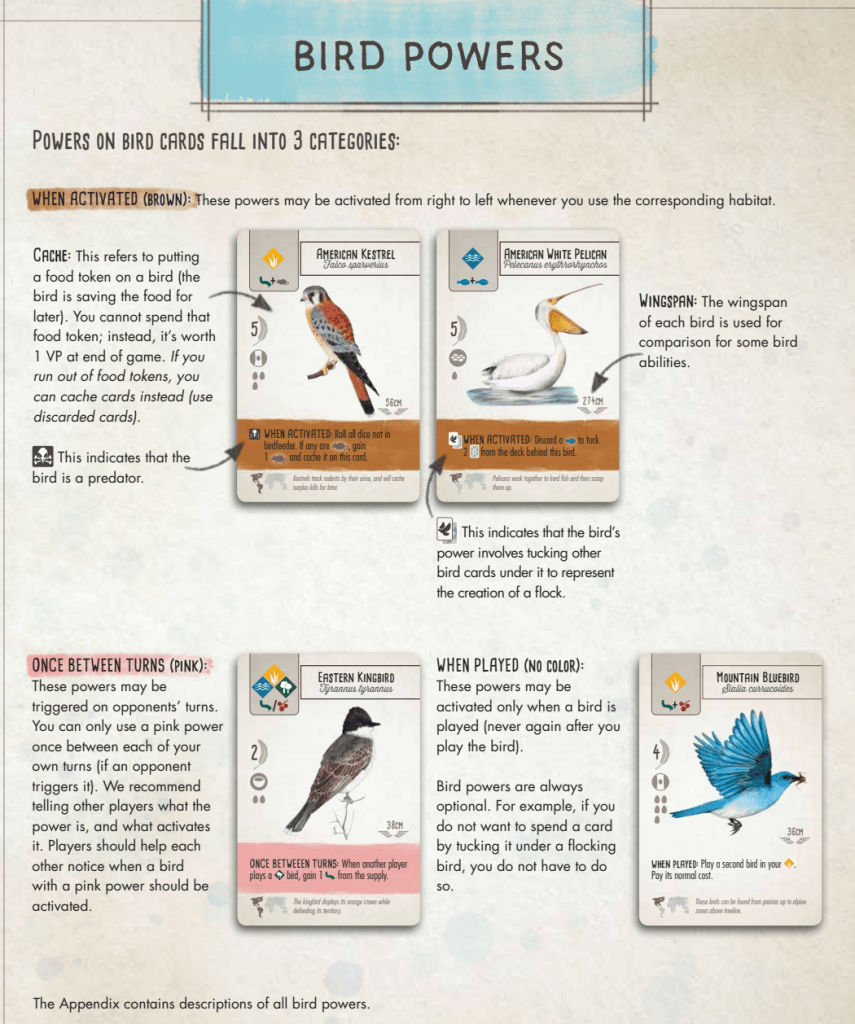 Wingspan avoids needing a separate FAQ by building potential questions directly into its rulebook appendix, which includes an “Automa Clarifications” section, a detailed component list, and most importantly, a card-by-card clarification section that addresses potentially confusing bird powers. Rather than waiting for players to get confused and publish an FAQ later, the designers anticipated which cards might cause questions and proactively included clarifying text in the rulebook. When players encounter a bird card with unusual timing or interactions, they can reference the appendix by card name to find specific guidance. This preemptive approach means the rulebook itself contains the answers to questions that would otherwise populate an FAQ, integrated naturally into the reference material players already consult. The appendix format keeps this detailed information from cluttering the learn-to-play section while ensuring comprehensive coverage of edge cases.