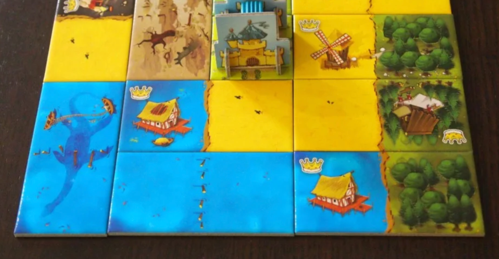 Kingdomino employs the Von Restorff Effect through its crown symbols, which appear on certain terrain tiles as small golden icons that contrast sharply with the illustrated landscapes. Most tiles simply show terrain without additional markings, creating a visual baseline. Crown tiles break this pattern with prominent yellow symbols and structures of some type that immediately draw the eye, making them memorable during tile selection. This visual distinctiveness reinforces their mechanical importance—crowns multiply the value of connected terrain during scoring. Players learn quickly to prioritize crown tiles because the visual triggers memory of their special scoring benefit.