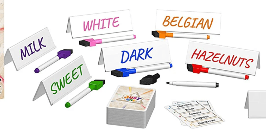Just One uses the Von Restorff Effect through its dry-erase boards and tabletop easels, which are unique physical components in a game market dominated by cards and tokens. While most party games use paper, cards, or apps for communication, Just One’s white boards and plastic easels create a unique tactile and visual experience. The act of writing on and displaying these boards makes the game memorable and recognizable—people remember “the one with the little easels.” The physical difference serves gameplay by making each player’s clue visible when revealed, and the unusual component choice helps the game stand out both on shelves and in players’ memories as something different from typical card-based party games.
