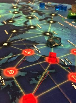 Pandemic is a cooperative game where selective attention can quietly kill the team. The board communicates threats through disease cubes. Simple, visible, and countable. The problem is that players naturally focus on their own regions, filtering the board down to their local areas while a three-cube city develops unnoticed across the map. Or another way this happens is if a player is only focusing on one color, they can easily miss the others. Experienced players learn to periodically force a full-board scan, essentially overriding their brains’ filtering tendency through deliberate habit. It’s an interesting example of a game that requires players to actively manage their own selective attention as a core cooperative skill.